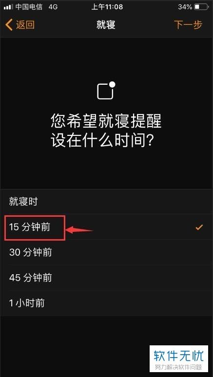 7. 第七步,设置就寝提醒时间,选择15分钟前。