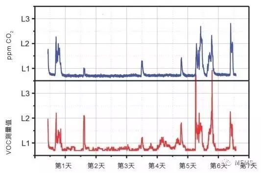 图3中,在VOC传感器指示空气品质下降期间,CO2传感器完全没有任何动静,这可能是由于在会议休会期间使用清洁化学品,或者来自打印机和复印机等设备的排放造成的。因应VOC传感器的输出(而非CO2传感器的指示),通常会有更好的通风;因此,在此例中,出现VOC事件期间,将会为居住者改善房间中的空气品质。