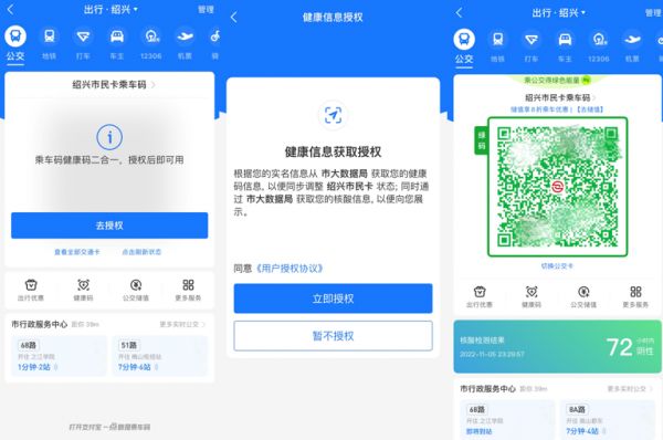 打开支付宝App首页点击“出行”进入绍兴市民卡乘车码页面将收到自动弹窗提示,根据提示可一步完成关联健康信息的授权。授权完成后,公交乘车码将自动核验健康状态,无须在乘车码与多个码之间进行切换,出行更为方便。