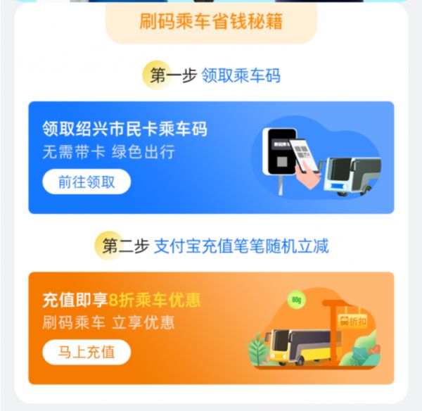 绍兴市民可在支付宝上搜索“绍兴市民卡”储值最高可减8元。每个用户每月可享受一次储值优惠。充值成功后,使用【绍兴市民卡乘车码】刷码,乘车享笔笔8折优惠。