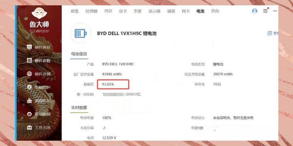 例如,这台电脑的电池健康度达到了93.05%,这表明其电池状态相当良好。打开鲁大师软件后,依次选择“硬件参数”和“电池页面”,即可查看相关电池信息和健康度,例如示例中显示的93.05%健康度表示电池状态良好。