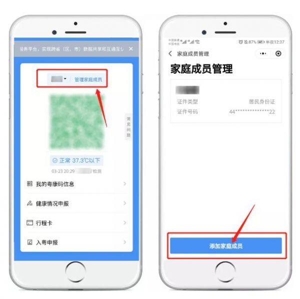 如家里有老人、小孩等不方便使用手机的人员,可点击粤康码上方的“添加家庭成员”,填入家庭成员的姓名与身份证号,并让其进行人脸识别认证。