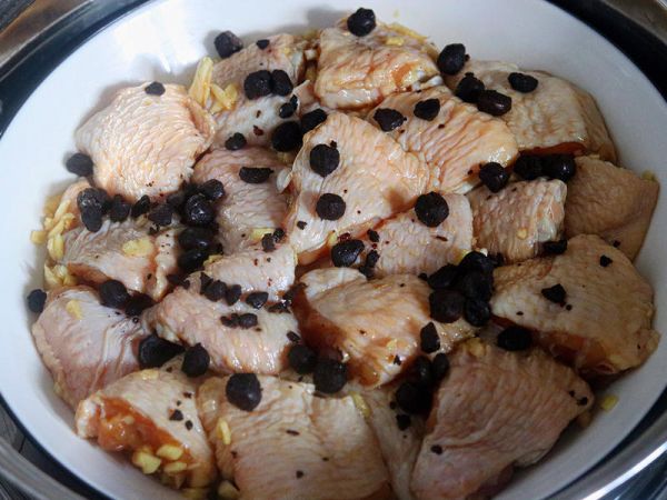 腌好的鸡翅摆在盘中,加入1小勺植物油和15g豆豉,把蒸锅里的水烧开,放入鸡翅蒸20分钟