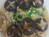每个鸡翅放点蚝油,然后摆盘,香菇划十字装饰,把香菇铺在鸡翅上面,再撒上姜丝,上架蒸8分钟。
