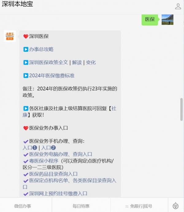 温馨提示:微信搜索公众号【深圳本地宝】,关注后在对话框回复【医保】可获深圳医保缴费标准、医保报销比例及报销流程、异地怎么看病报销、医保个人账户余额查询入口、医保家庭账户绑定、门诊报销限额多少等