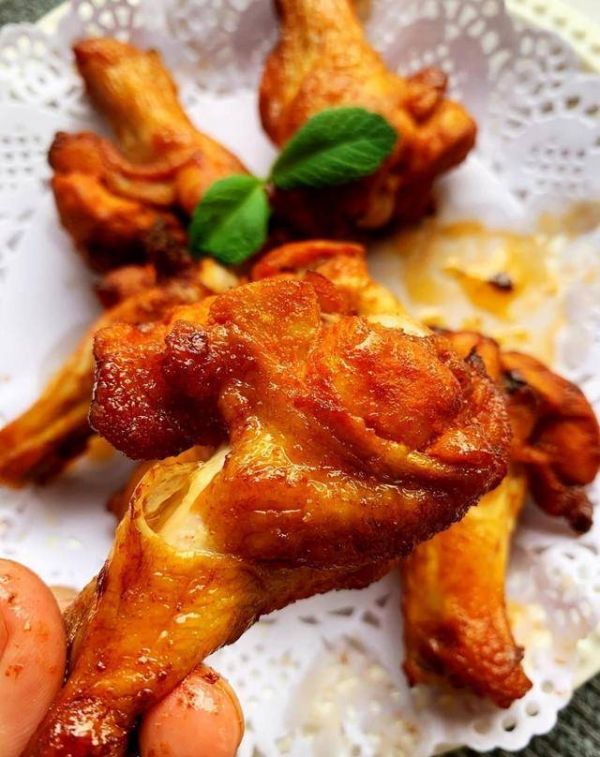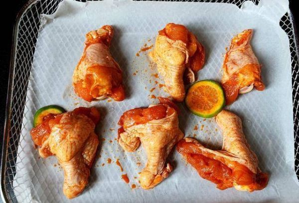 4、提前预热空气炸锅(没有空气炸锅的朋友可以用烤箱来代替将温度调至200度,烤箱提前预热,设置上下火180度进行烤制)再将腌制入味的鸡翅根放入空气炸锅烤制20分钟。不同的空气炸锅可能会有差别,根据实际情况进行调整即可。当烤至一点油也没有的时候就证明你已经成功了,一份外皮焦香,里面多汁的柠香奥尔良烤翅根就出锅了。