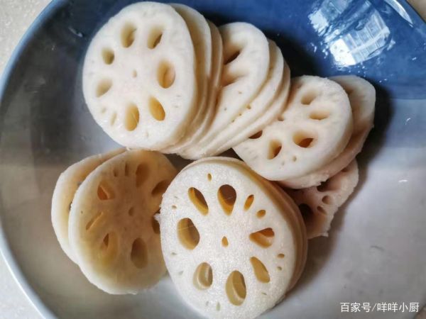 4、将莲藕去皮,洗净,切片;枸杞清洗干净后,用水泡发备用。