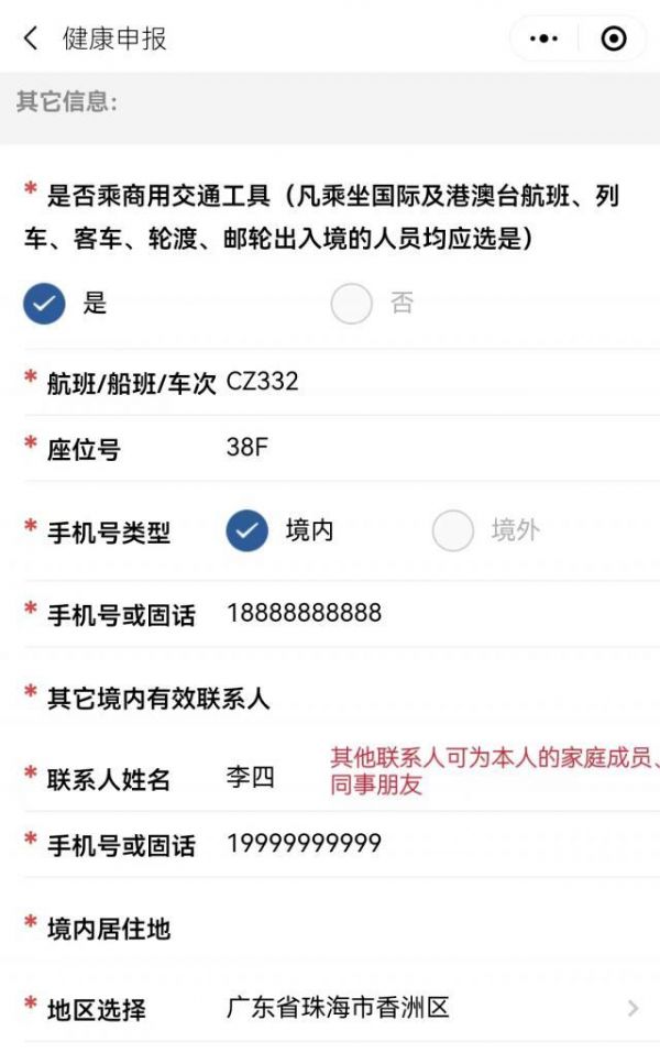 注意:第 5 项内容,香港往珠海方向的旅客需填写且需持有 48 小时核酸阴性证明入境,澳门往珠海方向的旅客无需填写。