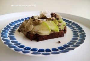 第5步.附上我的使用方法→ 一片快手面包(用Sunny方子做的,真的很湿软,而且细密,对我来说已经可以替代蛋糕了)➕一层厚厚的“假奶油”➕一小块苹果切成薄片(你可以用其他水果,比如梨,桃,草莓,蓝莓,芒果替换) 然后一层苹果,一层奶油,一层苹果,一层奶油……这样重叠 最后,顶上淋一点枫糖浆,撒一些可可粒或者椰丝,椰片……(你没有也可以不加)