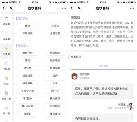 孕妇在怀孕期间会遇到很多不适之处,新增的症状解读能够针对症状解读详情。症状百科囊括了从备孕期、孕早期到产后、新生儿期等各个时期。对于妈妈们经常碰到的症状,也会进行简单罗列,一一对应释症状知识。页面采用医生问答的形式展现,专家解答让妈妈更安心。