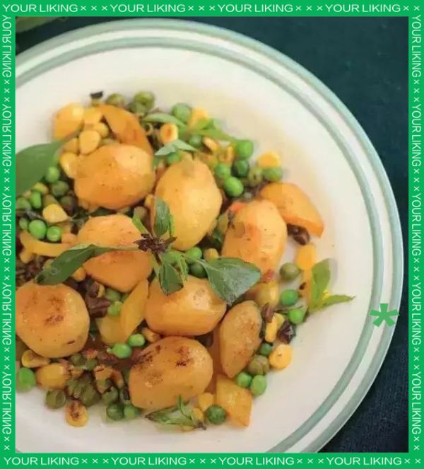 小土豆若干,绿豆适量,玉米粒少许,彩椒一个,九层塔几片。