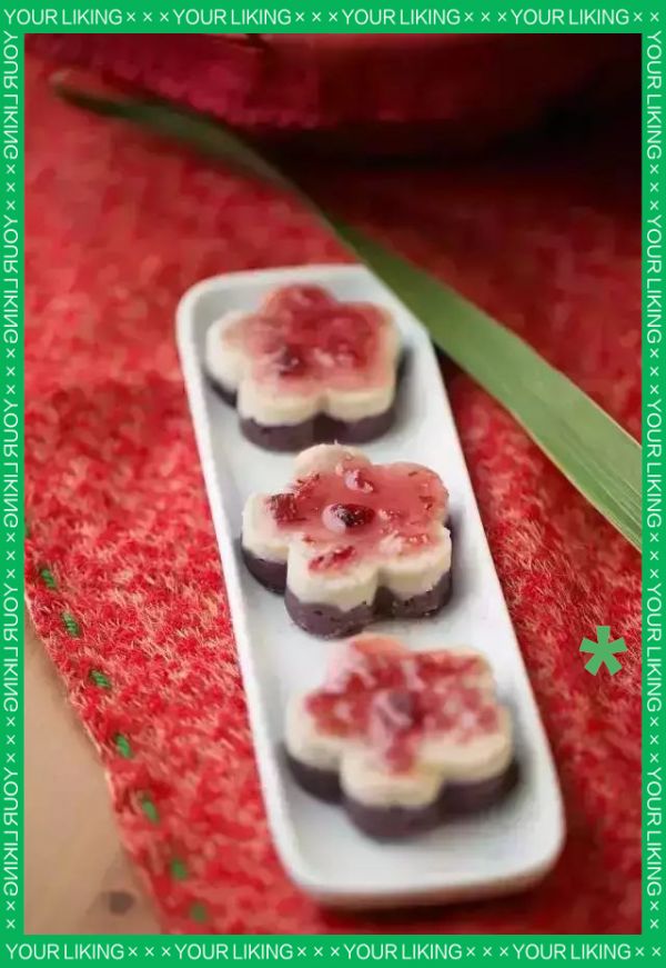 在梅花形状的模具中,先铺入山药泥,压实,再覆盖上紫薯泥,之后将模具倒置,使山药泥和紫薯泥自然脱模。