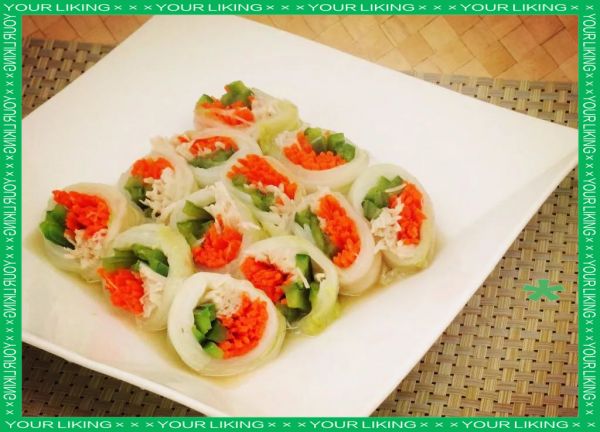将泡软的大白菜叶子摊平,内侧朝上,然后在叶子梗的一端依次摆上金针菇段、胡萝卜丝和青彩椒丝,之后将其卷起并裹紧。
