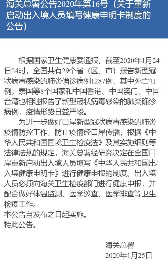 【导语】:出入境健康申明卡,是与出入境人员有关的一个举措,为的是预防突发性流感疾病的传播。2020年1月26日,海关总署发布公告,在全国口岸重新启动出入境人员填写《出入境健康申明卡》进行健康申报的制度