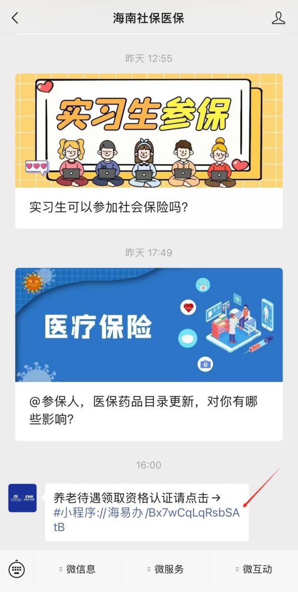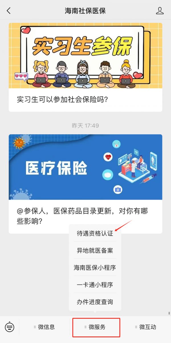 1、“海南社保医保”微信公众号菜单栏中,选择“微服务”——“待遇资格认证”