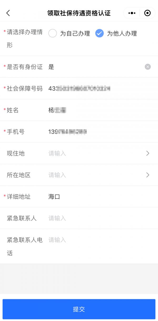 5、用自己手机给自己做认证选“为自己办理”,如果是用自己手机帮别人做认证,选“为他人办理”。填入个人信息,社会保障号码为身份证号码。点击“提交”