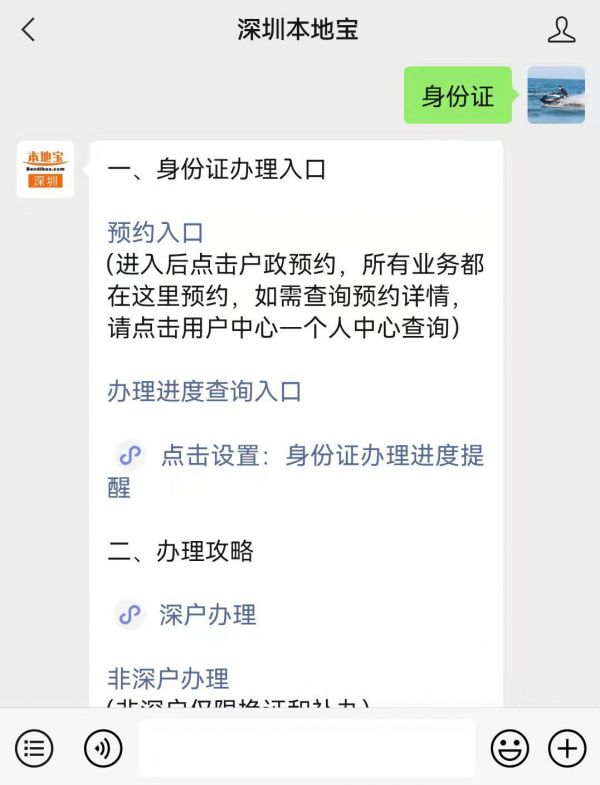 温馨提示:微信搜索公众号【深圳本地宝】,关注后在对话框回复【身份证】可获取深户及非深户身份证预约办理入口、申补换办理攻略、自助机查询及照片回执自助拍摄等有关内容。
