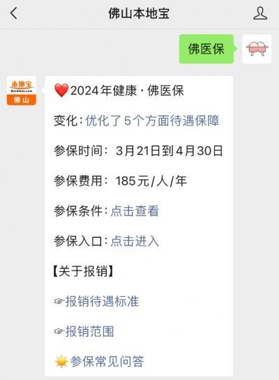 温馨提示:微信搜索关注【佛山本地宝】微信公众号,对话框回复【佛医保】即可获取2024年佛医保参保入口、报销范围/比例、待遇优化详情、常见问题...等。