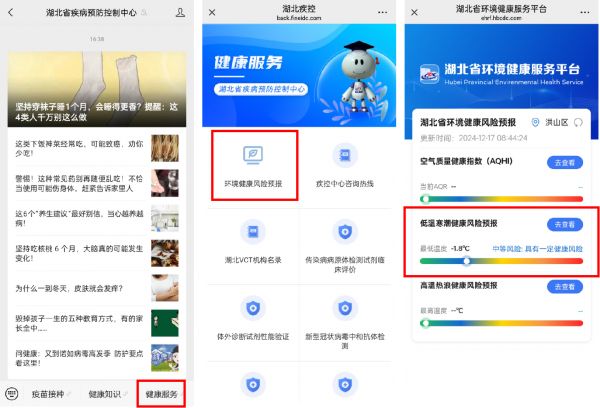 公众打开湖北省低温健康风险预防发布平台查询方式如下:关注“湖北省疾病预防控制中心”微信公众号,点击右下角的“健康服务”,在新页面中选择“环境健康风险预报”,在三个功能模块中选择“低温寒潮健康风险预报”,具体操作如下图所示。