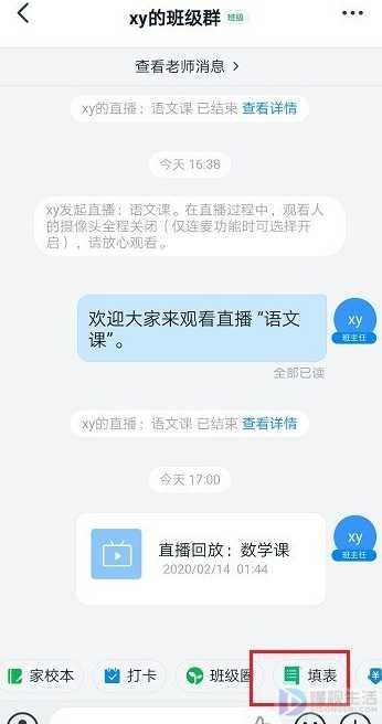 第一步,手机上打开钉钉,进去班级群之后,点击填表,如下图所示: