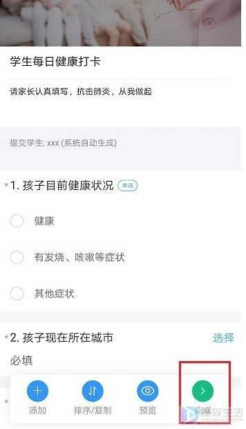 第三步进去学生每日健康打卡界面,可以设置打卡内容,点击完成,如下图所示: