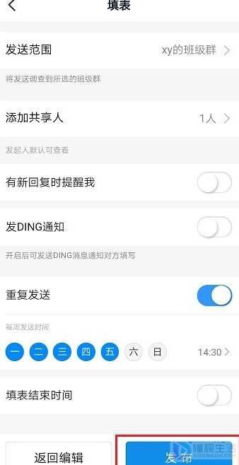 第四步,进去之后,选择打卡的学生和重复要求打卡,点击发布,如下图所示: