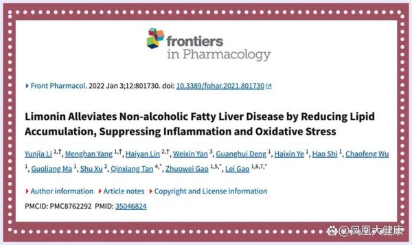发表在frontiers in Pharmacology的研究发现,柠檬中的柠檬苦素可以通过减少脏脂质积累并下调脂肪生成转录因子 FASN 和 SREBP1 的表达,起到缓解脂肪肝的作用。