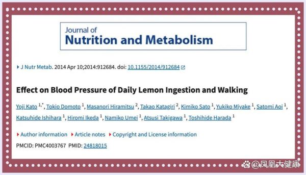 来自日本研究人员发表在Journal of Nutrition and Metabolism杂志上的研究发现,每天摄入柠檬外加散步,有降低收缩压的功效。这是因为柠檬中的儿茶素、酚类化合物、以及黄酮类物质都对血压有一定的抑制作用。