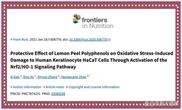 一项发表在frontiers in nutrition的研究发现,柠檬皮多酚含有没食子酸、新绿原酸、儿茶素、咖啡酸、儿茶素没食子酸酯、异绿原酸A、迷迭香酸和原儿茶酸等成分,可以保护细胞免受氧化压力,从而起到皮肤抗衰的作用。