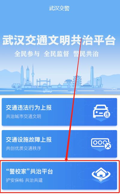 (一)进入“武汉交警”小程序,点击并进入警校家共治平台
