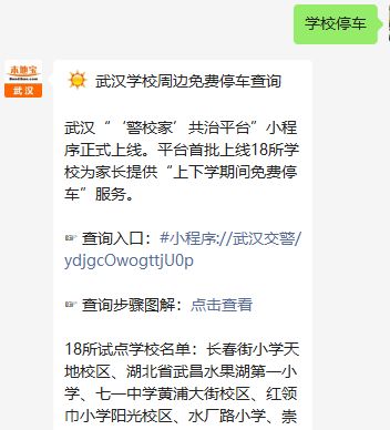 温馨提示:微信搜索公众号【武汉本地宝】,关注后在对话框回复【学校停车】即可获武汉学校周边免费停车点查询入口(停车时段+具体地点),查询方法、首批试点学校名单