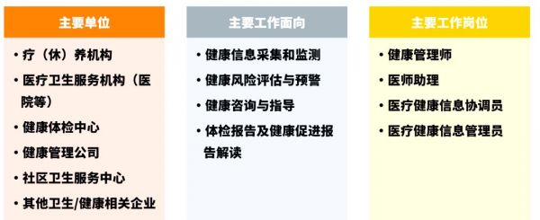 毕业生可从事健康管理师等职业,他们将在综合医院、社区卫生服务中心、健康管理公司、疗养院、健康体检中心等医疗服务机构内工作,负责健康监测与干预,以提升个人或群体的健康水平。这些专业人员需要具备采集和监测健康信息的能力,并能提供咨询和指导,从而有效执行健康管理计划。