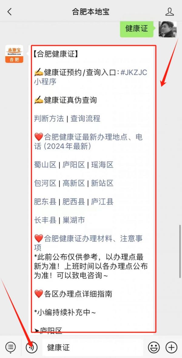 温馨提示:微信搜索公众号【合肥本地宝】,关注后在聊天对话框回复【健康证】获取合肥健康证线上预约入口、办理费用、办理材料、各区最新办理地点+时间、各社康办理指南等!