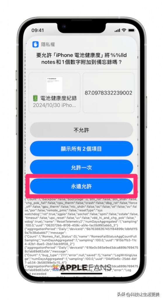 3. 使用「iPhone 电池健康度」捷径时,若出现隐私权相关提示,请放心按下【永远允许】即可。