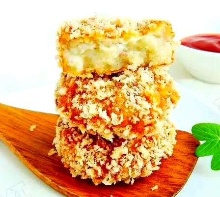 10、当油温达到六成热时,小心地将裹好面包糠的小饼放入锅中炸至金黄酥脆。炸好后,用厨房纸巾吸去多余油脂,即可享用。