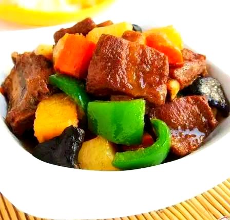 待锅中的排骨炖至软熟后,将土豆、香菇和胡萝卜块放入锅中,加入适量的盐进行调味。接着,继续炖煮至土豆和胡萝卜变软。最后,在临出锅前,放入青椒片进行翻炒,即可出锅享用。