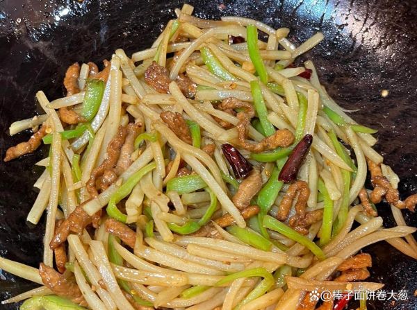 土豆丝炒至断生后加盐调味,加入提前炒熟的肉丝,加老抽上色,生抽提鲜,大火翻炒30秒即可出锅。