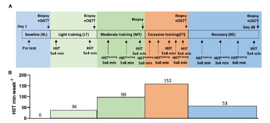 DOI: 10.1016/j.cmet.2021.02.017首先研究人员假设在训练负荷逐渐增加的训练计划中,人类受试者的运动训练负荷与线粒体功能、葡萄糖代谢和运动训练的生理适应性之间存在钟形关系。为了验证其假设,团队招募了6名女性和5名男性健康受试者参加了为期4周的训练干预,包括高强度间歇训练(HIIT)。在最初的3周,研究团队逐渐延长锻炼时间,从而研究不同负荷锻炼的生理反应。在第四周,运动负荷逐渐减少。在整个干预过程中,进行了组织活检和口服葡萄糖耐量试验,以评估不同阶段的代谢反应。