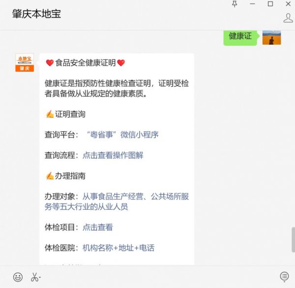 温馨提示:微信搜索公众号【肇庆本地宝】,关注后在对话框回复【健康证】可获肇庆健康证体检机构名单、健康证明查询入口、查询流程、常见问题解答、相关政策法规等