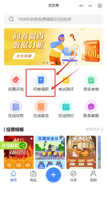 打开【龙艺秀小程序】,点击「问卷调研」,开始创建问卷调查。
