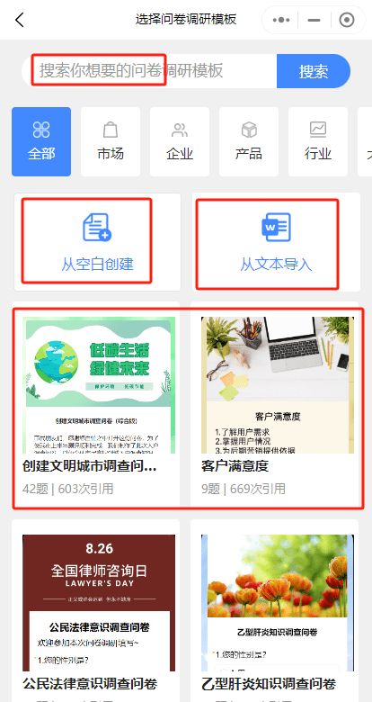 您可以自定义创建空白问卷,也可选择模板创建,搜索一下你需要的模板,修改一下即可,也可以从文本中导入问卷。