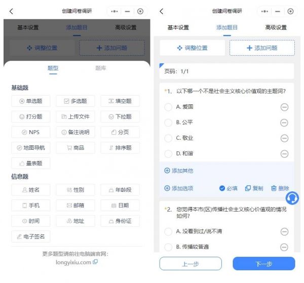 例如:单选、多选、矩阵单选、多选、填空题、图频上传、文件上传、逻辑跳转、自增表格等等题目,满足多种需要。