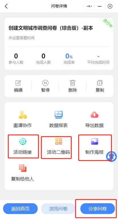 创建完成发布,点击「分享问卷」即可将页面发送给别人进行问卷填写。也可以生成海报、二维码链接等进行分享。可以嵌入公众号,接入到文章、菜单栏、自动回复等地方。