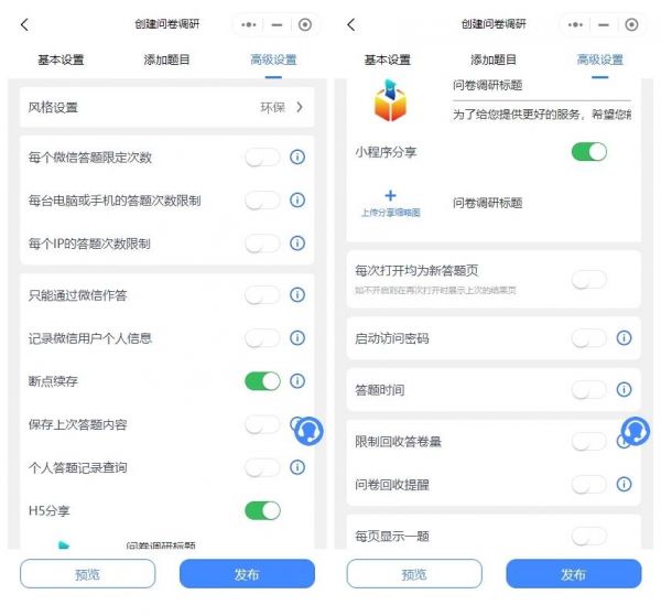 可以对问卷风格进行设置,还有时间设置、‘答题设置、回收设置、分享设置等等。