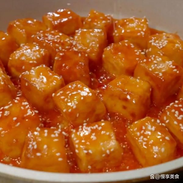 4、另起锅倒入食用油,冷锅冷油倒入调好的糖醋汁,开小火熬至冒泡,下入煎好的豆腐块,翻拌均匀,出锅撒上白芝麻就可以开吃了。