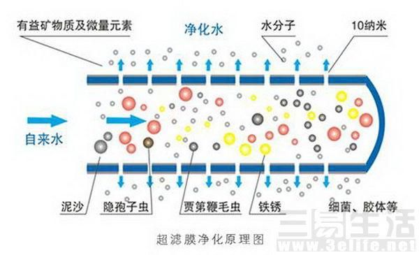 超滤是以压力为推动力,利用超滤膜不同孔径对液体进行分离的物理筛分过程。其分子切割量一般为6000到50万,孔径为0.1-0.01微米,在水处理中主要是可以过滤细菌病毒、色素、炭粉等大分子有机物,但对于农药、洗涤剂等低分子的有机物、重金属等有害的物质则不能有效去除。总的来说,它在原理实现更像我们生活中的筛子筛选杂质一样。