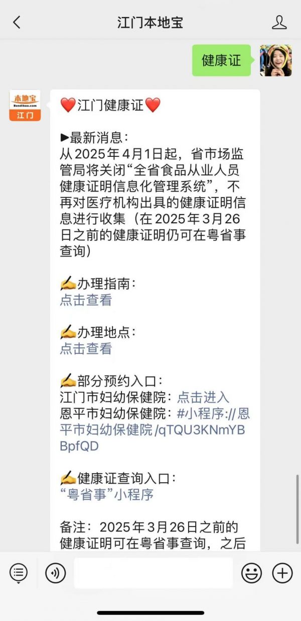 江门健康证办理机构温馨提示:微信搜索公众号江门本地宝,关注后在对话框回复【健康证】可获健康证办理指南、网上预约入口、材料、介绍信下载、体检时间地点等内容。