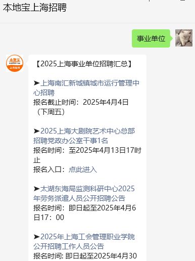 温馨提示:微信搜索关注公众号【本地宝上海招聘】,对话框发送【事业单位】即可获取上海事业单位招聘汇总,教师招聘、大厂招聘、更多工作岗位,敬请关注!