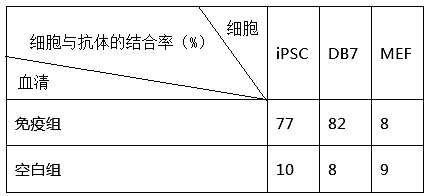 实验一:取免疫组和空白组小鼠的血清分别与iPSC、DB7(一种癌细胞)和MEF(一种正常体细胞)混合,检测三种细胞与血清中抗体的结合率,结果见下表。