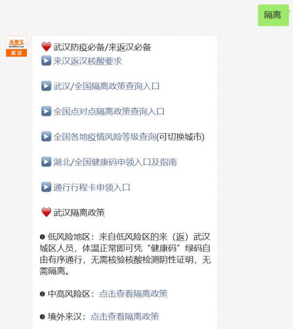 温馨提示:微信搜索公众号武汉本地宝,关注后在对话框回复【隔离】可查询武汉/全国最新隔离核酸要求、全国疫情风险等级名单、重点地区来汉管理措施。